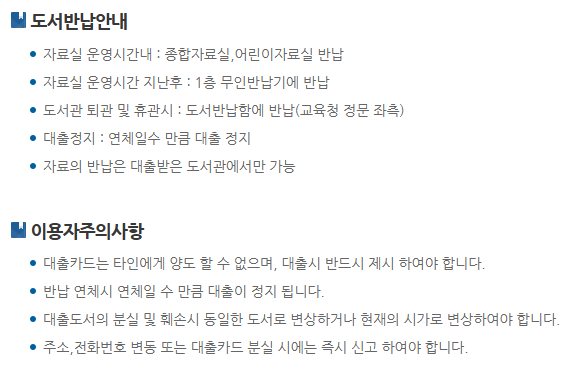 도서 대출과 관련해 홈페이지에 게제되어있는 내용을 가져왔습니다.