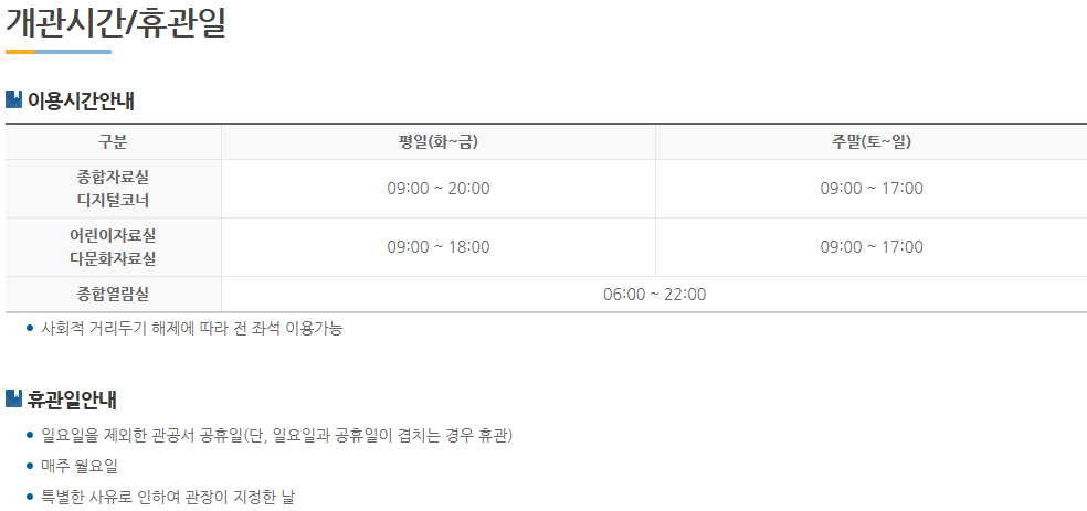 개관시간은 09시이며 화요일부터 금요일까지 어린이자료실은 18시 종합자료실은 20시까지이며 주말은 17시까지 입니다.