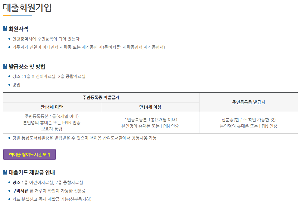 관내열람 : 1일 3권 당일 반납(신분증 또는 대출증 지참)