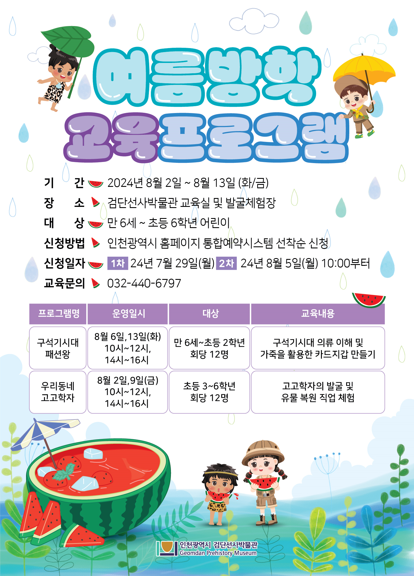 이창석 시 검단선사박물관장은 “많은 어린이가 이번 여름 방학 프로그램에 참여해 선사시대와 고고학의 매력을 느낄 수 있기를 바란다”고 말했다.